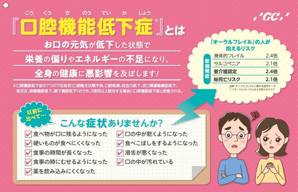 口腔機能低下症とは、おくちの回りの機能の低下により、栄養の偏りやエネルギー不足になり、全身の健康に悪影響を及ぼす可能性がある状態のことです。